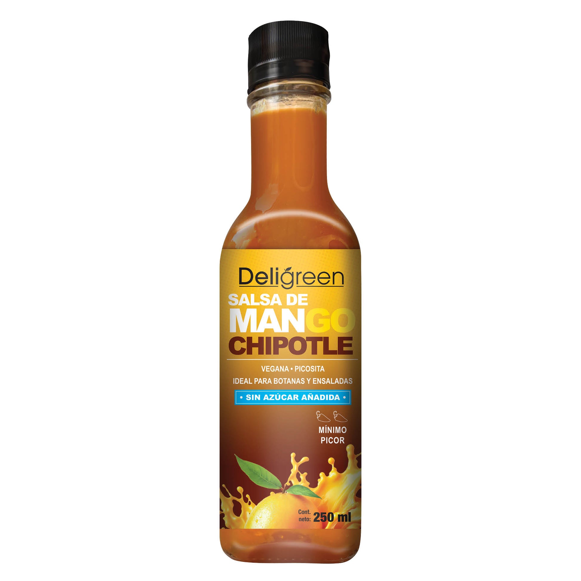Salsa Mango Chipotle: pulpa de mango, vinagre, agua, sal y chile chipotle.