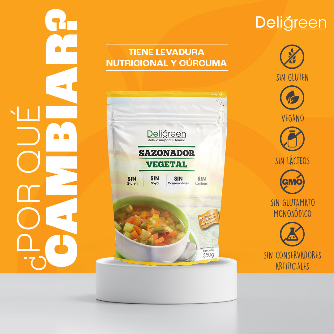Sazonador Vegetal Natural: Sal, azúcar, proteína vegetal hidrolizada, almidón de maíz, cebolla, sólidos de maíz, aceite, inosinato y guanilato, levadura nutricional, ajo, cúrcuma, apio y perejil.