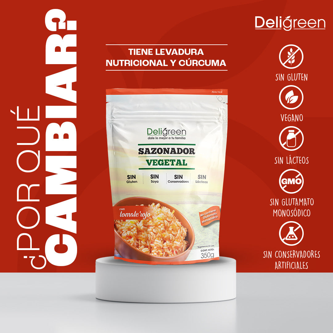 Sazonador Vegetal con Jitomate: Sal, azúcar, proteína vegetal hidrolizada, almidón de maíz, cebolla, sólidos de maíz, aceite, inosinato y guanilato, levadura nutricional, jitomate, paprika, ajo, cúrcuma, apio y perejil.